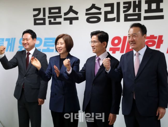 김미애(왼쪽 두번째) 부산 해운대구을 국회의원이 28일 오전 서울 여의도 김문수 국민의힘 제21대 대통령 선거 경선 후보 캠프 사무실에서 김문수 후보 지지선언을 하고 있다.