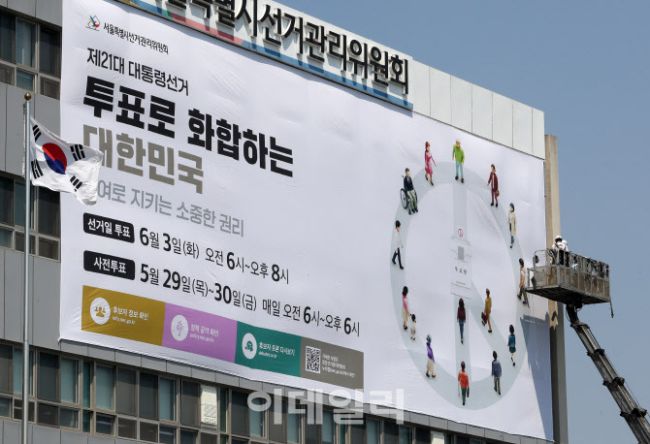 서울시선거관리위원회는 29일 서울 종로구 서울시선관위 외벽에 제21대 대통령 선거 투표일과 투표참여 등을 홍보하기 위한 대형 홍보 현수막을 게시했다. 6월 3일 실시되는 선거는 오전 6시부터 오후 8시까지 진행되며 사전투표는 5월 29일, 30일 양일간 오전 6시부터 오후 6시까지 투표할 수 있다.