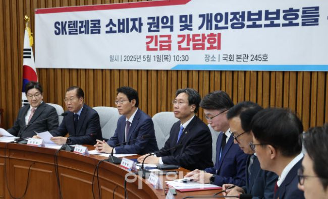 권영세 국민의힘 비상대책위원장이 1일 오전 서울 여의도 국회에서 열린 SK텔레콤 소비자 권익 및 개인정보보호를 위한 긴급 간담회에서 모두발언하고 있다.