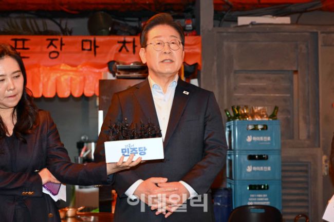 이재명 더불어민주당 대선 후보가 1일 서울 종로구의 한 음식점에서 열린 비전형 노동자 간담회 종료 후 대법원 판결에 대한 입장을 밝히고 있다. 대법원 전원합의체는 이날 이 후보에게 무죄를 선고한 원심판결을 파기하고 사건을 서울고법으로 돌려보냈다.