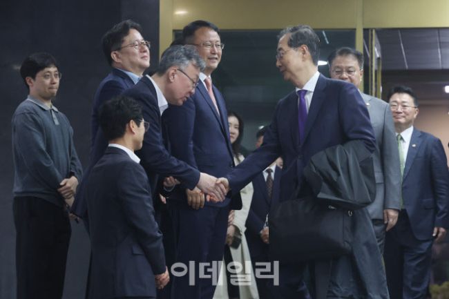 [포토]직원들과 인사하는 한덕수 대통령 권한대행