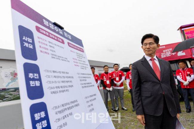 김문수 국민의힘 대선 후보가 16일 국회 세종의사당 부지에서 국회 이전과 관련해 관계자의 설명을 듣고 있다.