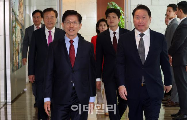 김문수 국민의힘 대선후보와 최태원 대한상의 회장이 22일 서울 중구 남대문로 대한상공회의소에서 열린 '김문수 국민의힘 대선후보-경제5단체 간담회'에 참석하고 있다.