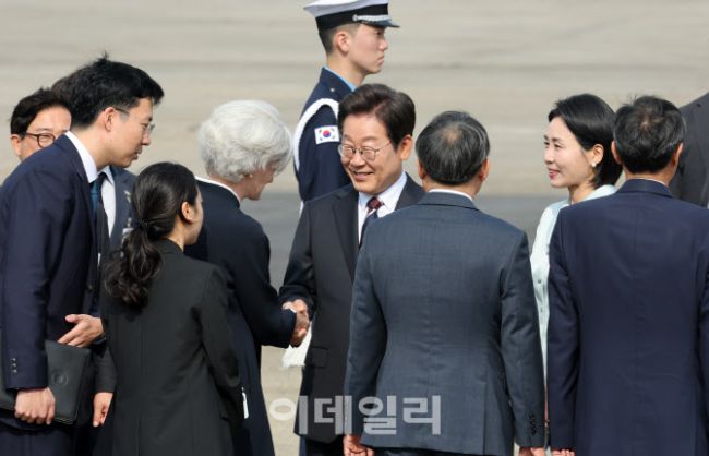 주요 7개국(G7) 정상회의 참석차 캐나다를 방문하는 이재명 대통령과 부인 김혜경 여사가 16일 성남 서울공항에서 타마라 모휘니 주한캐나다 대사와 이야기를 나누고 있다.