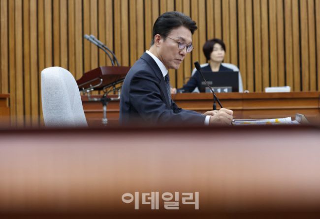 김민석 국무총리 후보자가 24일 서울 여의도 국회에서 열린 국무총리(김민석) 임명동의안 심사를 위한 인사청문회에서 의원들의 질의를 들으며 메모하고 있다.