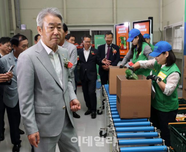 강호동 농협중앙회장이 24일 서울 서초구 하나로마트 양재점에서 열린 ‘농협싱씽몰(fresh&fast) 바로바로팜 서비스 오픈’ 시연 행사에 참여하고 있다. ‘농협싱씽몰(fresh&fast) 바로바로팜’은 농협몰에서 주문한 농산물을 도심 물류거점인 하나로마트 양재점을 통해 전국 소비자에게 통합 배송하는 서비스이다. 또한, 기존의 유통단계를 축소하여 소비자들은
