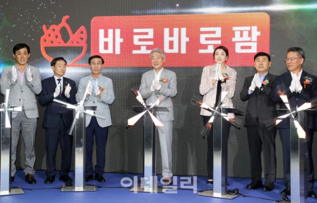 강호동(왼쪽 네번째부터) 농협중앙회장과 조현민 한진 사장 등이 24일 서울 서초구 하나로마트 양재점에서 열린 ‘농협싱씽몰(fresh&fast) 바로바로팜 서비스 오픈 행사’에서 오픈 퍼포먼스를 하고 있다. ‘농협싱씽몰(fresh&fast) 바로바로팜’은 농협몰에서 주문한 농산물을 도심 물류거점인 하나로마트 양재점을 통해 전국 소비자에게 통합 배송하는 서비스