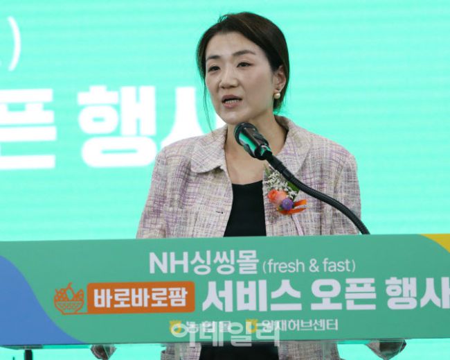 조현민 한진 사장이 24일 서울 서초구 하나로마트 양재점에서 열린 ‘농협싱씽몰(fresh&fast) 바로바로팜 서비스 오픈 행사’에서 인사말을 하고 있다. ‘농협싱씽몰(fresh&fast) 바로바로팜’은 농협몰에서 주문한 농산물을 도심 물류거점인 하나로마트 양재점을 통해 전국 소비자에게 통합 배송하는 서비스이다. 또한, 기존의 유통단계를 축소하여 소비자들은