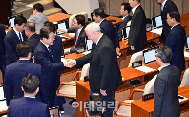이재명 대통령이 26일 오전 서울 여의도 국회에서 민생회복 소비쿠폰사업 등을 편성한 추가경정예산(추경)에 대한 시정연설을 마치고 인요한 국민의힘 의원과 인사를 하고 있다.