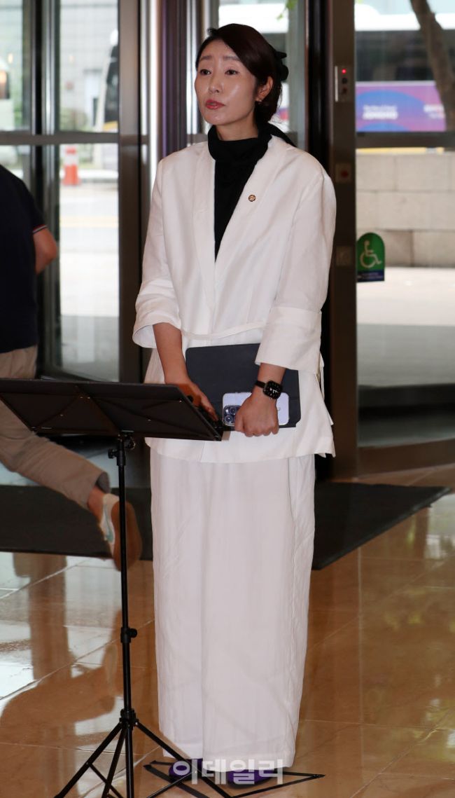 강선우 여성가족부 장관 후보자가 26일 오후 서울 종로구 이마빌딩에 마련된 인사청문회 준비사무실로 출근하며 소감을 밝히고 있다.