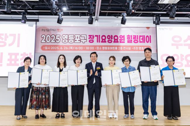 최호권(가운데) 영등포구청장이 6월 26일 영등포 아트홀 2층 전시실에서 열린 ‘어르신 돌봄 종사자 힐링데이’ 행사에 참석했다. 이번 행사는 요양보호사, 사회복지사, 간호(조무)사 등 장기요양기관에 근무하며 현장에서 묵묵히 헌신하고 있는 어르신 돌봄 종사자들의 노고에 감사를 전하고, 지친 마음을 위로하기 위해 마련됐다. 행사에서는 ▲우수 요양보호사 표창 ▲