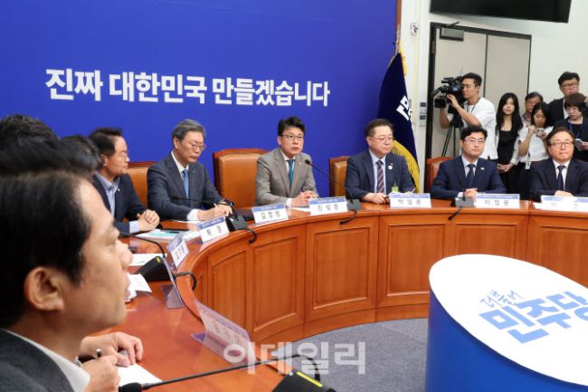 진성준 더불어민주당 정책위의장이 30일 서울 여의도 국회에서 열린 민주당-경제단체 상법 간담회에서 발언을 하고 있다. 오른쪽부터 이동근 한국경영자총협회 부회장, 이정문 정책위 수석부의장, 박일준 대한상공회의소 부회장, 진 정책위의장, 김창범 한국경제인협회 부회장.