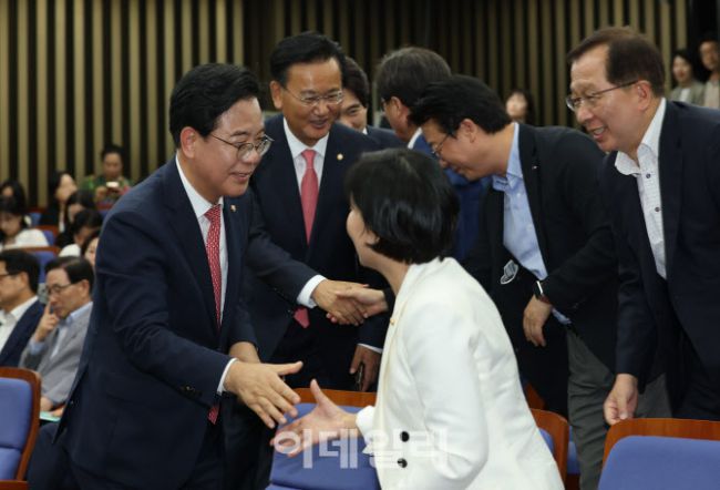 송언석 국민의힘 원내대표와 유상범 원내수석부대표가 30일 오후 서울 여의도 국회에서 열린 의원총회에 참석하며 의원들과 인사하고 있다.