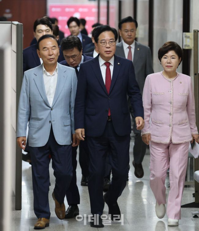 송언석 국민의힘 비상대책위원장 겸 원내대표와 비대위원들이 3일 오전 서울 여의도 국회에서 열린 비상대책위원회의에 참석하고 있다.