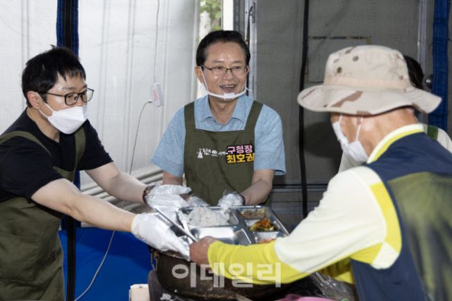 최호권(가운데) 영등포구청장이 4일 광야교회 무료급식소에서 나눔 봉사활동에 동참하고 있다. 광야교회의 무료급식 봉사활동은 지난 37년 동안 소외된 이웃에게 따뜻한 식사를 제공하며 나눔을 실천해오고 있다. 최호권 구청장은 “1987년부터 지금까지 두 팔 걷고 나서 주신 봉사자 여러분께 진심으로 감사드린다”라며 “오늘의 식사가 어려운 이웃 한 분 한 분에게 따