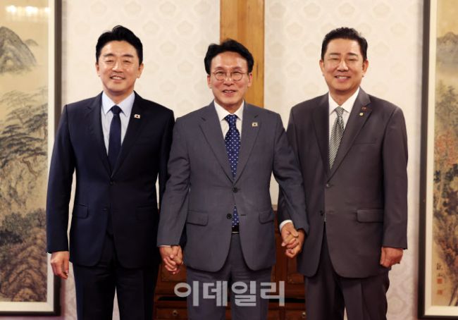 김민석 국무총리(가운데)와 김병기 더불어민주당 대표 직무대행 겸 원내대표(오른쪽), 강훈식 대통령 비서실장이 6일 오후 서울 종로구 삼청동 국무총리 공관에서 열린 이재명 정부 첫 고위당정협의회에서 기념촬영을 하고 있다.