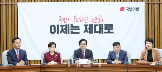 송언석 국민의힘 비상대책위원장 겸 원내대표가 8일 오전 서울 여의도 국회에서 열린 원내대책회의에서 모두발언을 하고 있다.