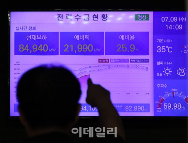 연일 이어지는 폭염으로 전력 수요가 치솟는 가운데 9일 오후 서울 중구 한국전력공사 서울본부 전광판에 전력 수요 현황이 표시되고 있다. 전력통계정보시스템에 따르면 전날 8일 최대전력은 95.7GW를 기록했다.