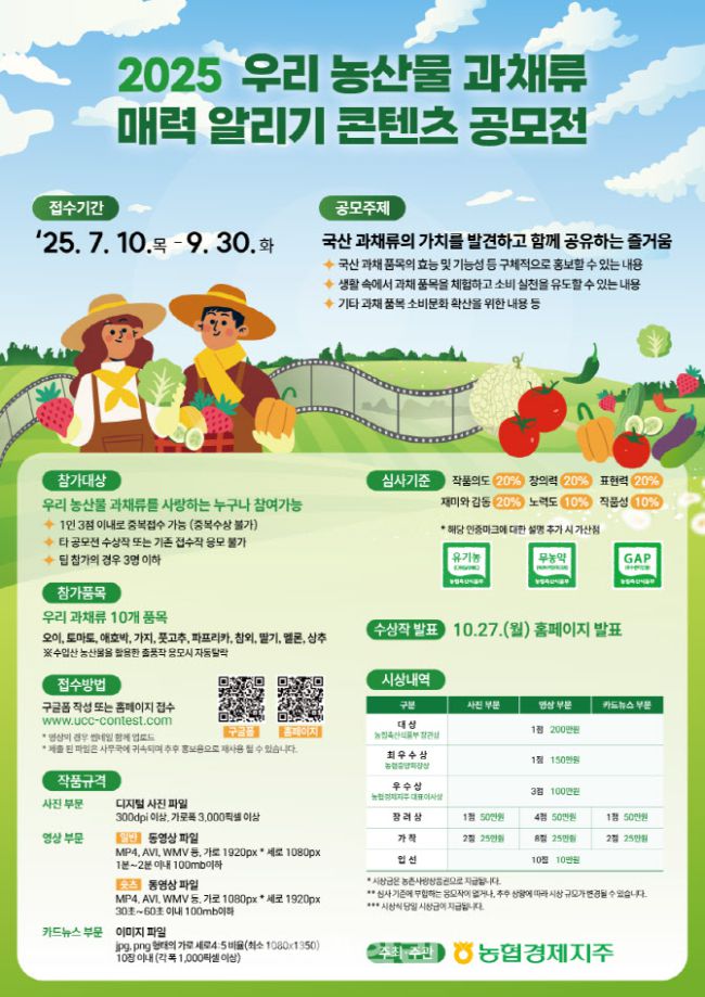농협 경제지주(농업경제대표이사 박서홍)는 7월 10일부터 9월 30일까지 국산 과채류의 우수성을 알리고 소비를 확대하기 위해「2025 우리 농산물 과채류 매력 알리기 콘텐츠 공모전」을 개최한다. ‘국산 과채류의 가치를 발견하고 함께 공유하는 즐거움’을 주제로 하는 이번 공모전은 ▲사진 ▲영상(UCC) ▲카드뉴스 등 3개 부문으로 나누어 진행되며, ▲과채류의