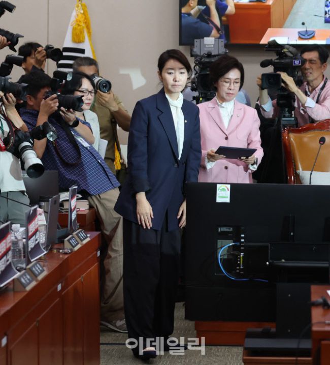 강선우 여성가족부 장관 후보자가 14일 오전 서울 여의도 국회 여성가족위원회에서 열린 인사청문회에서 선서문을 이인선 여가위원장에게 전달 후 자리로 돌아가고 있다.