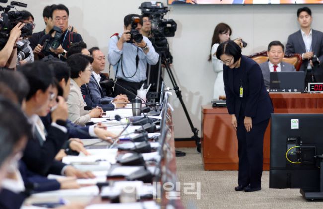 한성숙 중소벤처기업부 장관 후보자가 15일 오전 서울 여의도 국회 산업통산자원중소벤처기업위원회에서 열린 인사청문회에 출석, 의원들에게 허리숙여 인사하고 있다.