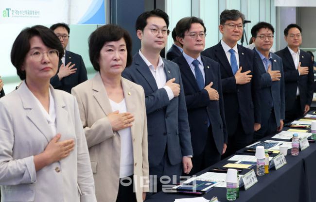 더불어민주당 물가대책 TF 위원들이 16일 서울 양재동 aT센터에서 열린 농림축산식품부, 한국농수산식품유통공사와의 간담회에서 국민의례를 하고 있다. 농수산물 유통 현황과 가격 안정 방안을 논의하기 위한 이번 간담회는 디지털 기반 유통 혁신을 통해 농산물 가격 안정과 생산자와 소비자 모두에게 이익이 돌아가는 유통 구조 개선 방안을 모색하고자 마련됐다. 김병기