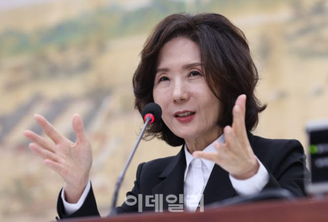 이진숙 사회부총리 겸 교육부 장관 후보자가 16일 오후 서울 여의도 국회 교육위원회 전체회의에서 열린 인사청문회에 출석, 질의에 답변하고 있다.