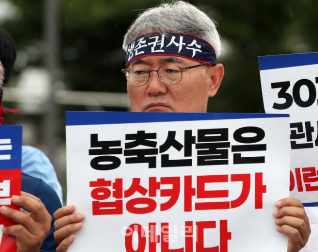18일 서울 용산구 대통령실 앞에서 '한-미 상호관세 협상 농축산물 개방 반대를 위한 전국농축산인 기자회견'에서 한 참석자가 비를 맞으며 집회에 참석하고 있다. 한국농축산연합회, 한국종합농업단체협의회, 축산관련단체협의회, 농민의길 등 전국농축산인 대표들은 이날 정부가 대미 수출 주력 산업인 자동차, 반도체, 철강 등 관세 완화 협상 타결을 위해 농축산물 시