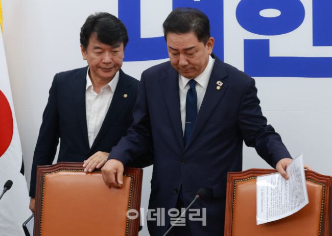 김병기(오른쪽) 더불어민주당 당대표 직무대행 겸 원내대표와 문진석 원내수석부대표가 22일 오전 서울 여의도 국회에서 열린 원내대책회의에 참석하고 있다.