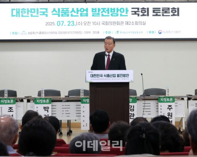 홍문표 한국농수산식품유통공사(aT) 사장이 23일 국회 의원회관에서 열린 ‘대한민국 식품산업 발전방안 국회 토론회’에서 환영사를 하고 있다. 국회 농림축산식품행양수산위원회와 공동으로 개최한 이날 토론회는 송미령 농식품부 장관, 어기구, 이만희, 이병진 국회의원과 식품업계, 농업단체, 학계 등 관계자 140여 명이 참석해 농식품 생태계 조성을 위한 방안을 논