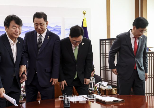 우원식 국회의장과 더불어민주당 김병기 당대표 직무대행 겸 원내대표, 국민의힘 송언석 비상대책위원장 겸 원내대표가 23일 오전 서울 여의도 국회에서 열린 의장 주재 여야 원내대표 회동에서 기념촬영을 마친 뒤 자리로 향하고 있다.