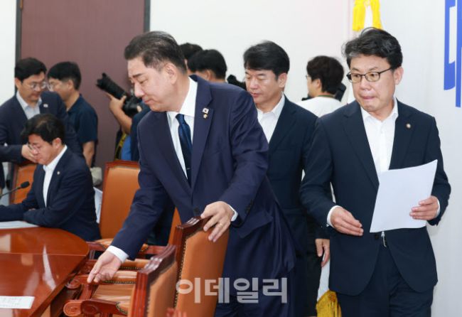 김병기 더불어민주당 당대표 직무대행 겸 원내대표와 진성준 정책위의장이 29일 오전 서울 여의도 국회에서 열린 원내대책회의에 참석하고 있다.