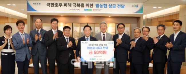 강호동(오른쪽 여섯번째부터) 농협중앙회장과 김철수 대한적십자사 회장이 31일 농협중앙회 본관에서 극한호우 피해지원 성금 전달식에서 참석자들과 기념촬영을 하고 있다. 범농협 전 계열사와 전국 농축협 임직원이 동참하여 모금한 50억원의 성금은 대한적십자사를 통해 극한호우로 피해를 입은 지역에 전달될 계획이다. 농협은 극한호우 피해지역에 긴급 구호물품 지원과 함