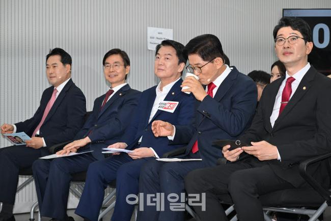 장동혁(왼쪽부터), 조경태, 안철수, 김문수, 주진우 국민의힘 당대표 후보가 3일 서울 여의도 국민의힘 당사에서 열린 제6차 전당대회 후보자 비전대회를 준비하고 있다.