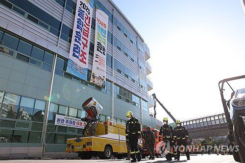 (광주=연합뉴스) 27일 오후 광주 동구 창의융합교육원에서 동부소방서 주관 '긴급구조 종합 훈련'이 열리고 있다. 21개 단체 360여명의 직원이 투입된 훈련은 재난 발생 시 긴급구조 대응 능력을 향상하고 지휘 체계를 확립하기 위해 마련됐다. 훈련은 건물 1층 공조실 가스 누출·폭발로 건물 붕괴 등 가상 재난 상황을 설정해 실상황처럼 이뤄졌다. 주요 훈련