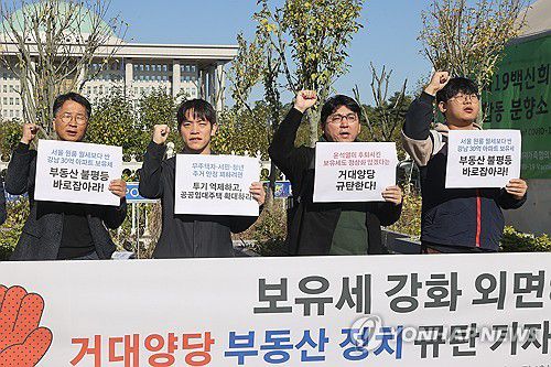 (서울=연합뉴스) 류효림 기자 = 참여연대를 비롯한 시민단체 회원들이 28일 서울 여의도 국회 앞에서 열린 보유세 강화 외면하는 거대양당의 부동산 정치 규탄 기자회견에서 구호를 외치고 있다. 2025.10.28 ryousanta@yna.co.kr ▶제보는 카카오톡 okjebo ▶연합뉴스 앱 지금 바로 다운받기~ ▶네이버 연합뉴스 채널 구독하기 <저작권자(c