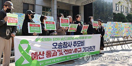 (청주=연합뉴스) 이성민 기자 = 오송 지하차도 참사 시민 추모단체인 '747오송역정류장'이 29일 오전 충북도청 앞에서 추모비 예산 통과를 촉구하는 기자회견을 열고 있다. 2025.10.29 chase_arete@yna.co.kr ▶제보는 카카오톡 okjebo ▶연합뉴스 앱 지금 바로 다운받기~ ▶네이버 연합뉴스 채널 구독하기 <저작권자(c) 연합뉴스,