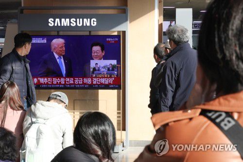 (서울=연합뉴스) 이진욱 기자 = 29일 서울역에서 시민들이 도널드 트럼프 미국 대통령 방한 관련 뉴스를 보고 있다. 2025.10.29 cityboy@yna.co.kr ▶제보는 카카오톡 okjebo ▶연합뉴스 앱 지금 바로 다운받기~ ▶네이버 연합뉴스 채널 구독하기 <저작권자(c) 연합뉴스, 무단 전재-재배포, AI 학습 및 활용 금지> <저작권자(c)연