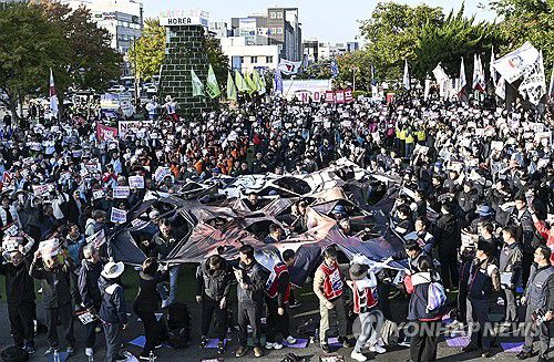 (경주=연합뉴스) 한종찬 기자 = 29일 경주역 폐역에서 민주노총 주최로 열린 경제 수탈 일자리 파괴 트럼프 방한 반대 결의대회에서 참가자들이 상징의식을 하고 있다. 2025.10.29 [공동취재] saba@yna.co.kr ▶제보는 카카오톡 okjebo ▶연합뉴스 앱 지금 바로 다운받기~ ▶네이버 연합뉴스 채널 구독하기 <저작권자(c) 연합뉴스, 무단 전
