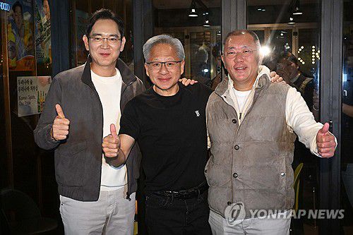 (서울=연합뉴스) 이진욱 기자 = 젠슨 황 엔비디아 최고경영자가 30일 서울 삼성동 한 치킨집에서 진행된 이재용 삼성전자 회장, 정의선 현대차그룹 회장과 회동을 마친 후 기념촬영을 하고 있다. 2025.10.30 [공동취재] cityboy@yna.co.kr ▶제보는 카카오톡 okjebo ▶연합뉴스 앱 지금 바로 다운받기~ ▶네이버 연합뉴스 채널 구독하기 <