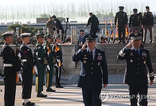 (서울=연합뉴스) 신준희 기자 = 진영승 합참의장과 존 대니얼 케인 미국 합참의장이 3일 용산구 국방부 연병장에서 열린 한미 군사위원회 회의(MCM) 환영 의장행사에서 의장대를 사열하고 있다. 2025.11.3 hama@yna.co.kr ▶제보는 카카오톡 okjebo ▶연합뉴스 앱 지금 바로 다운받기~ ▶네이버 연합뉴스 채널 구독하기 <저작권자(c) 연합뉴