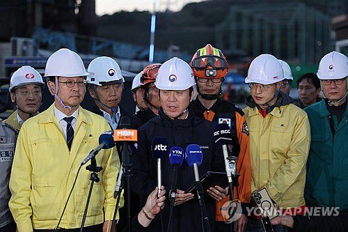 (울산=연합뉴스) 장지현 기자 = 울산화력발전소 보일러 타워 붕괴 사고 나흘째인 9일 오후 김영훈 고용노동부 장관이 현장 브리핑을 하고 있다. 지난 6일 발생한 이 사고로 매몰된 7명 중 3명의 시신이 수습됐다. 사망 추정 2명, 실종 2명이 아직 매몰돼 있다. 2025.11.9 jjang23@yna.co.kr ▶제보는 카카오톡 okjebo ▶연합뉴스 앱