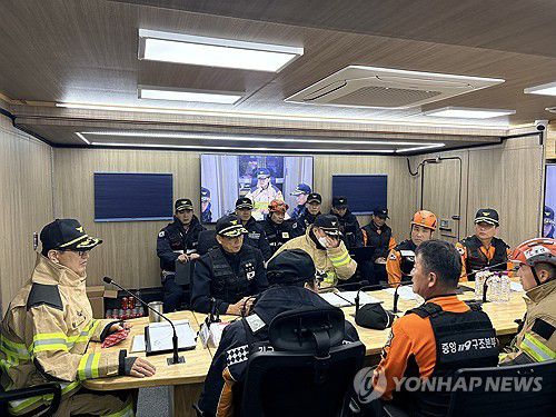 (서울=연합뉴스) 김승룡 소방청장 직무대행이 10일 울산화력발전소 붕괴 사고 현장에서 소방지휘부, 현장구조대원, 동서발전 관계자 등과 함께 상황판단회의를 열고 현장 안정화 진행 상황을 점검하고, 신속한 수색·구조 방안과 안전 확보 대책을 논의하고 있다. 2025.11.10 [소방청 제공. 재판매 및 DB 금지] photo@yna.co.kr ▶제보는 카카오톡