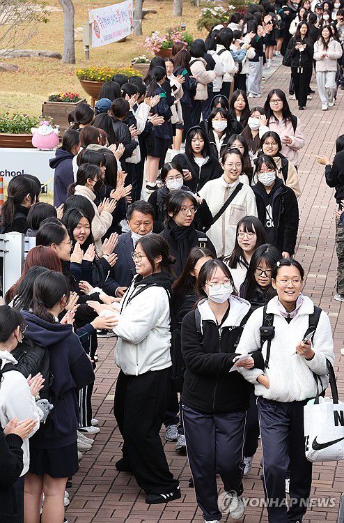 (부산=연합뉴스) 강선배 기자 = 2026학년도 대학수학능력시험을 하루 앞둔 12일 오전 부산 사상구 주례여고에서 고3 수험생들이 수험표를 받은 뒤 후배들의 응원을 받으며 학교를 나서고 있다. 2025.11.12 sbkang@yna.co.kr ▶제보는 카카오톡 okjebo ▶연합뉴스 앱 지금 바로 다운받기~ ▶네이버 연합뉴스 채널 구독하기 <저작권자(c)