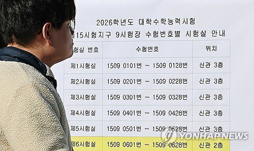 (서울=연합뉴스) 김인철 기자 = 2026학년도 대학수학능력시험(수능) 예비소집일인 12일 서울 종로구 중앙고등학교에서 한 수험생이 시험실을 확인하고 있다. 2025.11.12 yatoya@yna.co.kr ▶제보는 카카오톡 okjebo ▶연합뉴스 앱 지금 바로 다운받기~ ▶네이버 연합뉴스 채널 구독하기 <저작권자(c) 연합뉴스, 무단 전재-재배포, AI