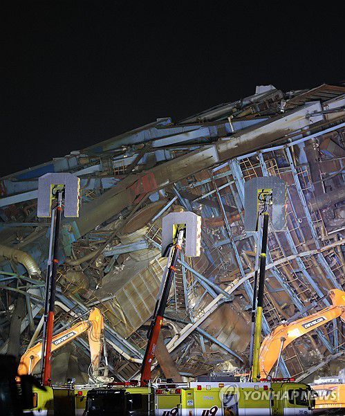 (울산=연합뉴스) 장지현 기자 = 울산화력발전소 보일러 타워 붕괴 사고 여드레째인 13일 오후 발전소 현장에서 중장비를 동원한 야간 수색 작업이 이어지고 있다. 지난 6일 발생한 이 사고로 현재까지 매몰자 7명 중 6명이 사망했고 1명이 잔해 속에 묻혀 실종된 상태다. 2025.11.13 jjang23@yna.co.kr ▶제보는 카카오톡 okjebo ▶연합