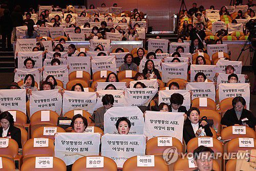 (서울=연합뉴스) 임화영 기자 = 18일 서울 강남구 코엑스에서 열린 에서 참석자들이 '양성평등의 시대, 여성이 함께'라는 문구가 적힌 현수막을 들고 구호를 외치고 있다. 2025.11.18 hwayoung7@yna.co.kr ▶제보는 카카오톡 okjebo ▶연합뉴스 앱 지금 바로 다운받기~ ▶네이버 연합뉴스 채널 구독하기 <저작권자(c) 연합뉴스, 무단