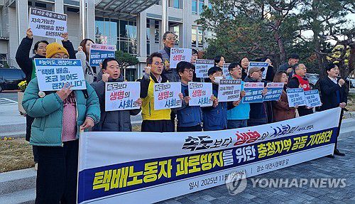 (대전=연합뉴스) 강수환 기자 = 민주노총 서비스노조 전국택배노조 충청지부가 19일 오전 대전시청 앞에서 기자회견을 열고 "택배 노동자 건강권을 보호하고 안전하고 지속 가능한 새벽 배송 방안을 마련해야 한다"고 촉구하고 있다. 2025.11.19 ▶제보는 카카오톡 okjebo ▶연합뉴스 앱 지금 바로 다운받기~ ▶네이버 연합뉴스 채널 구독하기 <저작권자(c