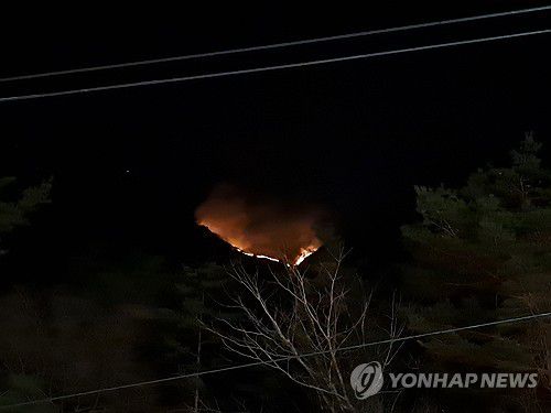 (양양=연합뉴스) 22일 오후 6시 26분께 강원 양양군 서면 서림리에서 난 산불이 번지고 있다. 양양군은 이날 오후 7시 35분께 서림리와 갈천, 송천 등 화재 지역 인근 주민들에게 재난 안전 문자를 통해 마을회관 등으로 대피할 것을 당부했다. 2025.11.22 [양양군 제공. 재판매 및 DB 금지] ryu@yna.co.kr ▶제보는 카카오톡 okjeb