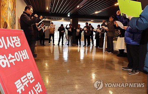 (전주=연합뉴스) 나보배 기자 = 전주대학교 정상화를 위한 비상대책위원회가 1일 오전 대학 총장실 앞에서 기자회견을 열고 "보직 교수 사퇴하라"고 구호를 외치고 있다. 2025.12.1 warm@yna.co.kr ▶제보는 카카오톡 okjebo ▶연합뉴스 앱 지금 바로 다운받기~ ▶네이버 연합뉴스 채널 구독하기 <저작권자(c) 연합뉴스, 무단 전재-재배포,